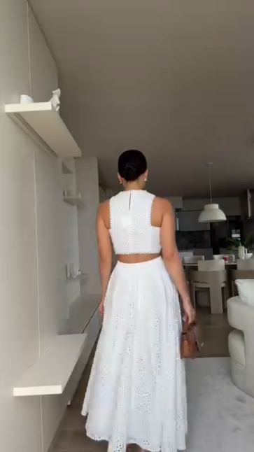 A saia midi com bordado inglês é rodada e levemente estruturada, com caimento impecável e cós alto que valoriza a cintura. O look inteiro é branco, clássico e atemporal — perfeito para almoços, eventos de verão ou momentos especiais à luz do dia.