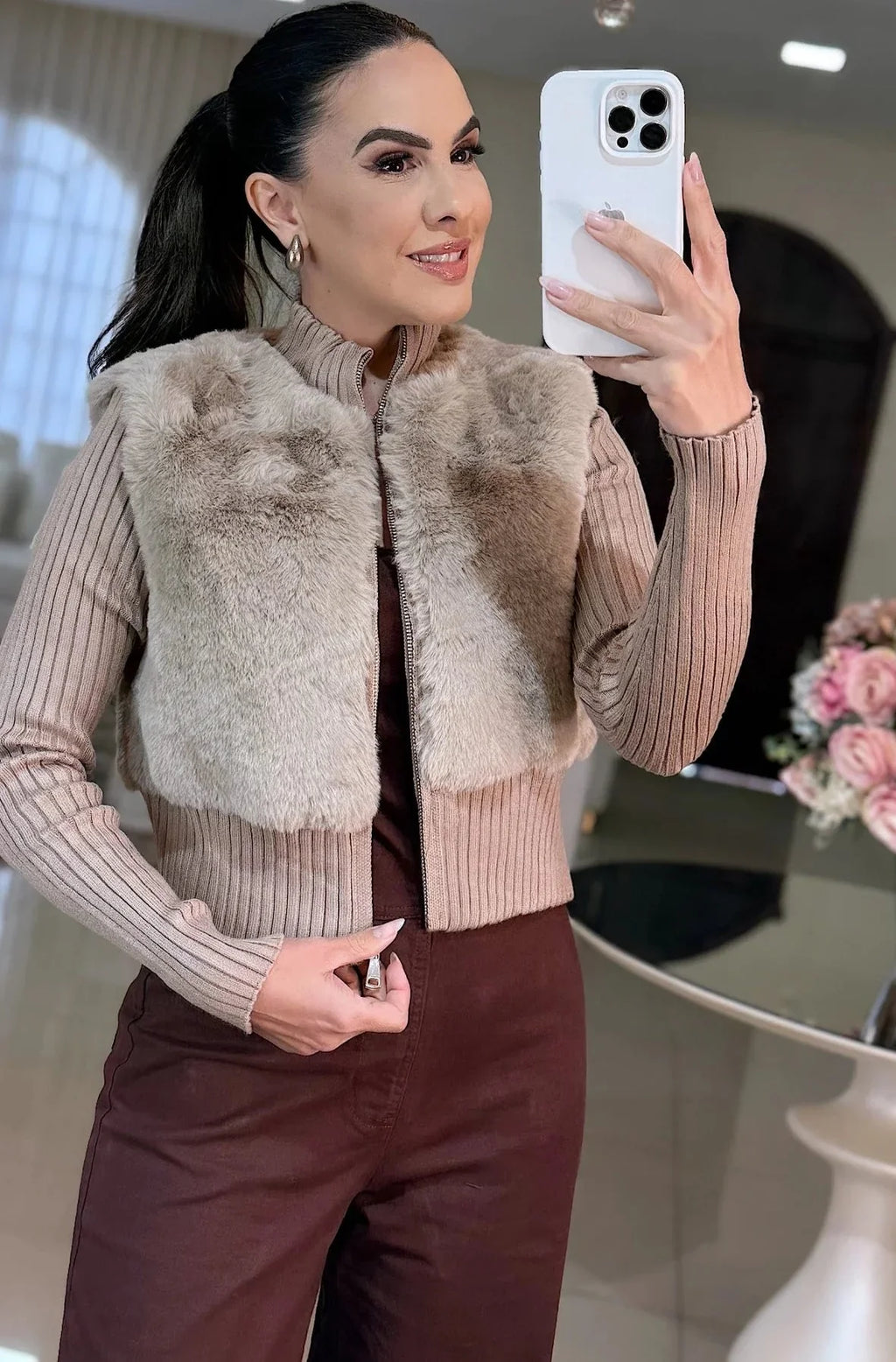 Casaco Shopie – Tricot com Pele Sintética Elegante - Bege